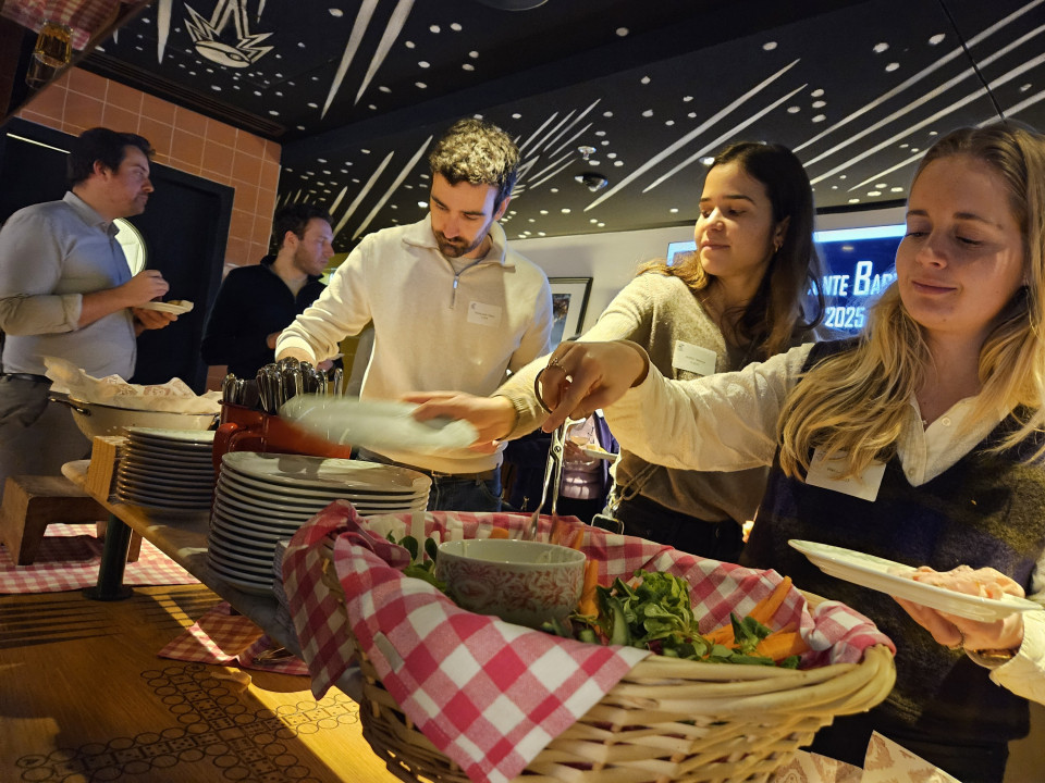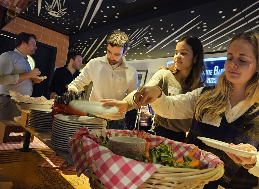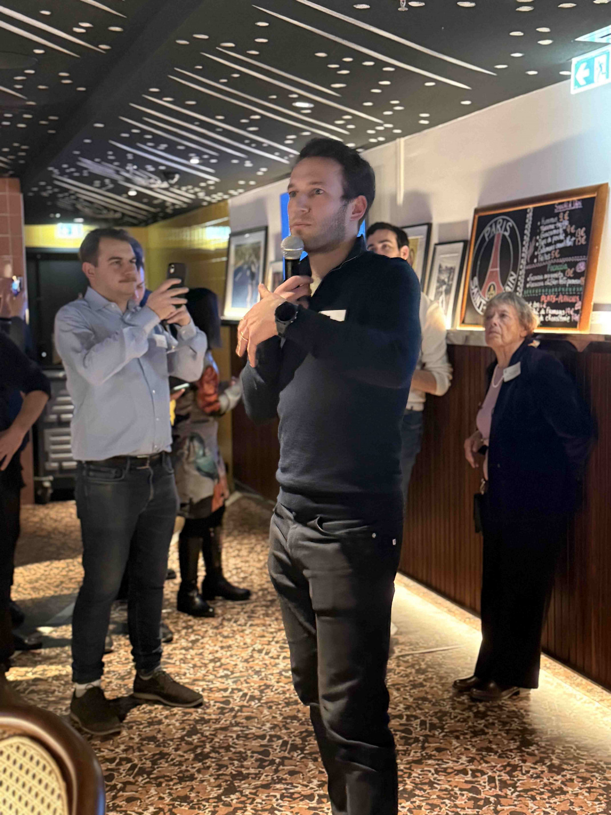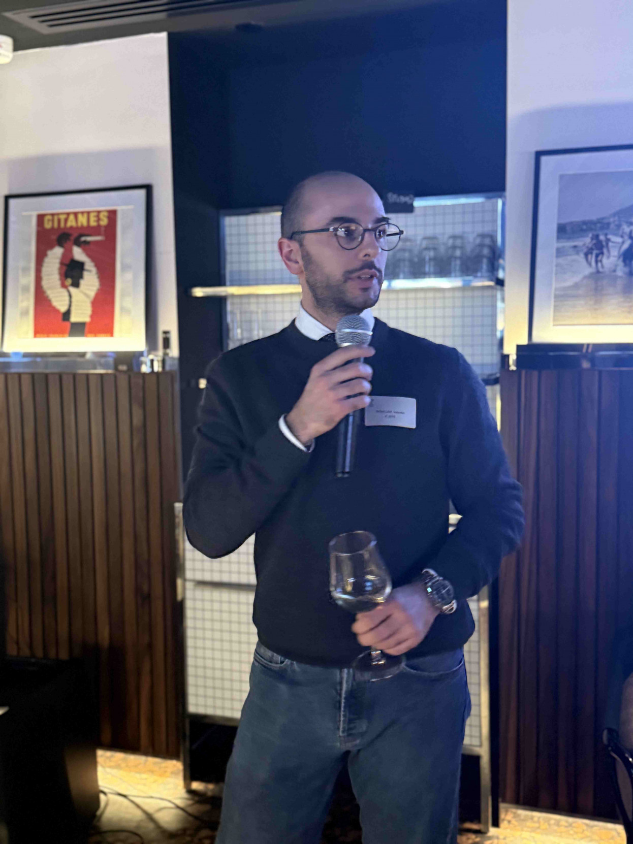 Une fois le buffet salé terminé, Matthias Burin des Roziers et Valentin Bouiller ont animé un petit quizz sur l'École. Au bout des 16 questions, quatre lots ont été remportés: un bon d'achat de 50€ pour le Fada le bar des Alumni de Mines Saint-Étienne, une bouteille de Mercurey rouge 2023, une bouteille d'huile d'olive grecque, ainsi qu'un pot de piment d'Espelette d'un producteur partenaire de Terra Go, le projet de Jérôme Peyron présenté plus tôt.