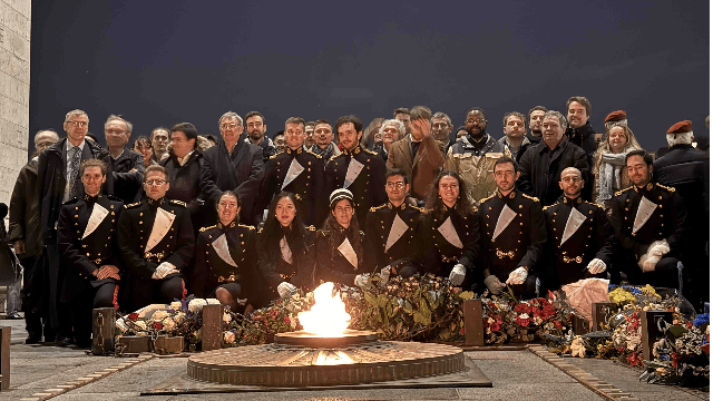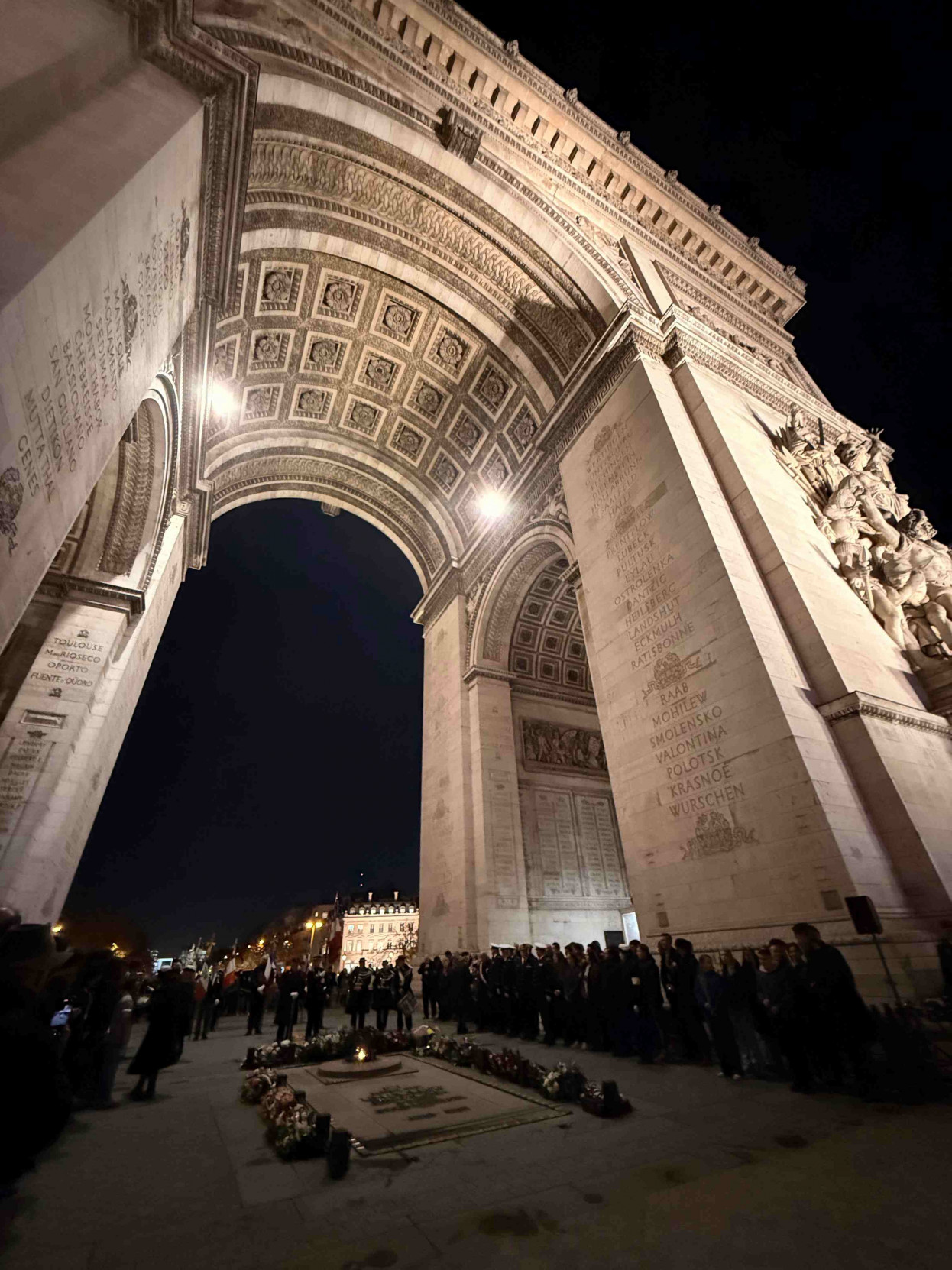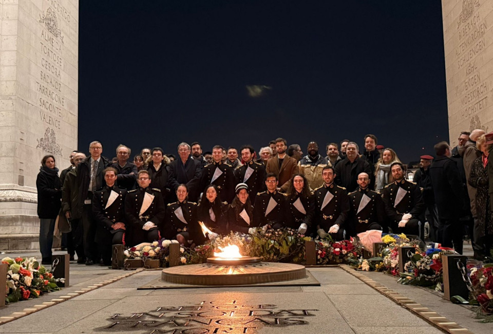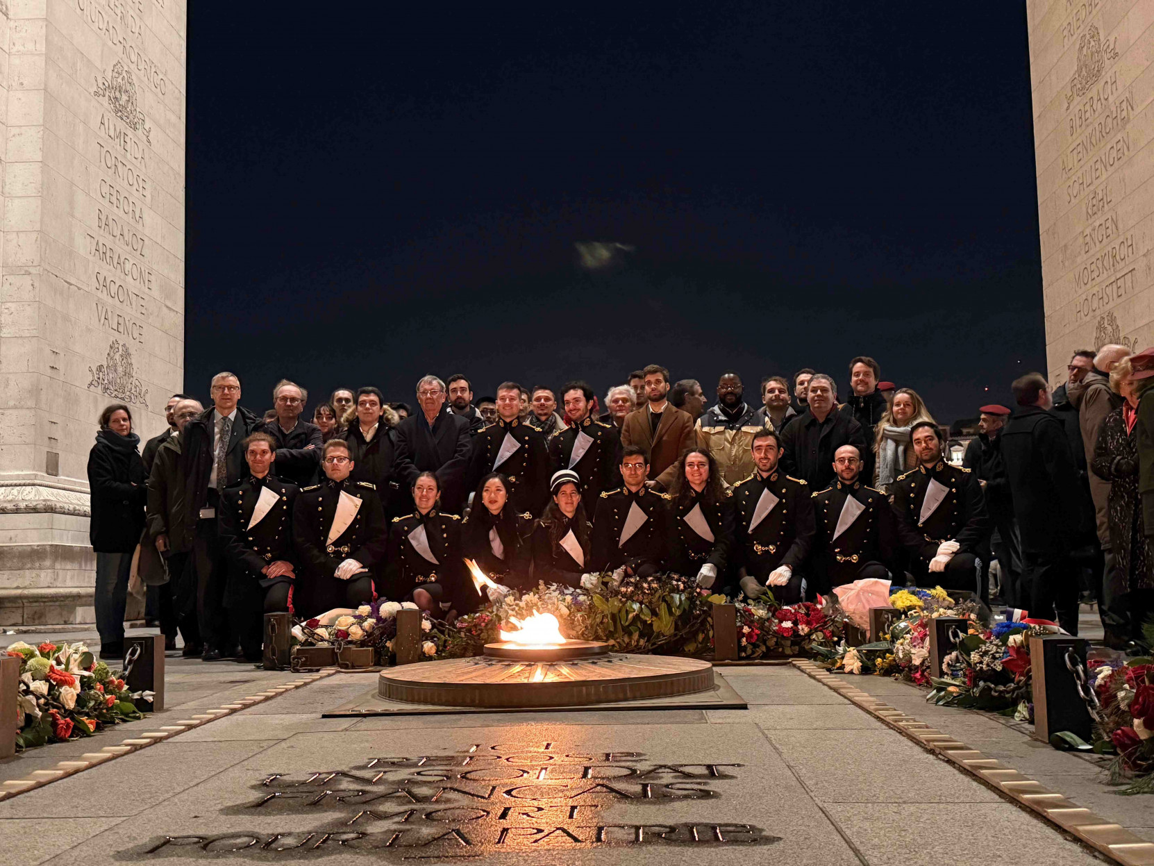 Une cinquantaine d'alumni, dont une douzaine portant l'uniforme, ainsi que Mme Delphine Baron (Directrice du Mécénat à la Fondation IMT) et M. Krzysztof Wolski (Directeur adjoint de l'École, Directeur des formations) se sont retrouvés à 18h en haut des Champs-Élysées pour participer à la cérémonie de ravivage de la Flamme sous l'Arc de Triomphe. Cette cérémonie quotidienne, ininterrompue depuis 1923, a pour but de raviver quotidiennement, au crépuscule, la Flamme sur la tombe du Soldat inconnu et, plus généralement, d'entretenir sa mémoire c'est-à-dire la mémoire de tous les combattants français et alliés tombés au champ d'honneur.