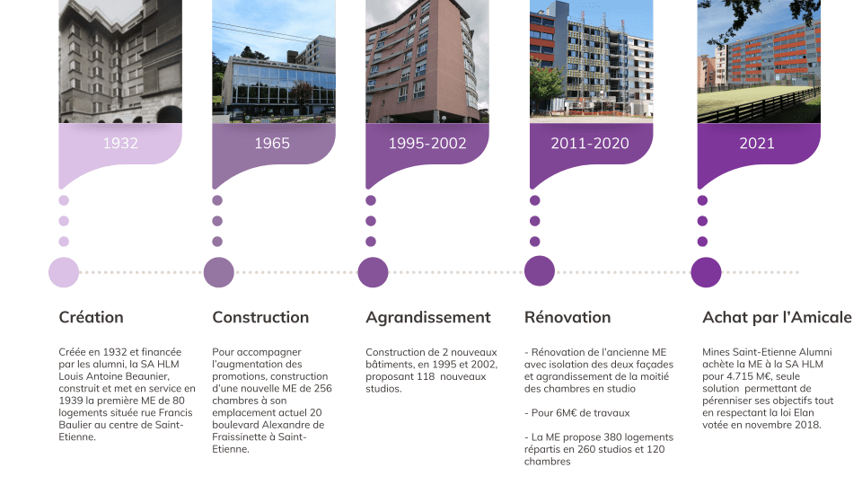 Mines Saint-Étienne Alumni est propriétaire de La Maison des Élèves (ME), située au 20, boulevard Alexandre de Fraissinette, à Saint-Étienne. La ME a pour principal objectif de loger durablement les Élèves de l'École, dans de bonnes conditions matérielles pour un coût modéré. Les équipements collectifs et associatifs ont notamment pour vocation de renforcer les liens de camaraderie et le sentiment d'appartenance à la communauté des élèves et anciens élèves de l'École. La Maison des Élèves joue un rôle socio-éducatif important en accompagnant les résidents dans leur vie de groupe et associative, en complément du cursus des Élèves de l'École.